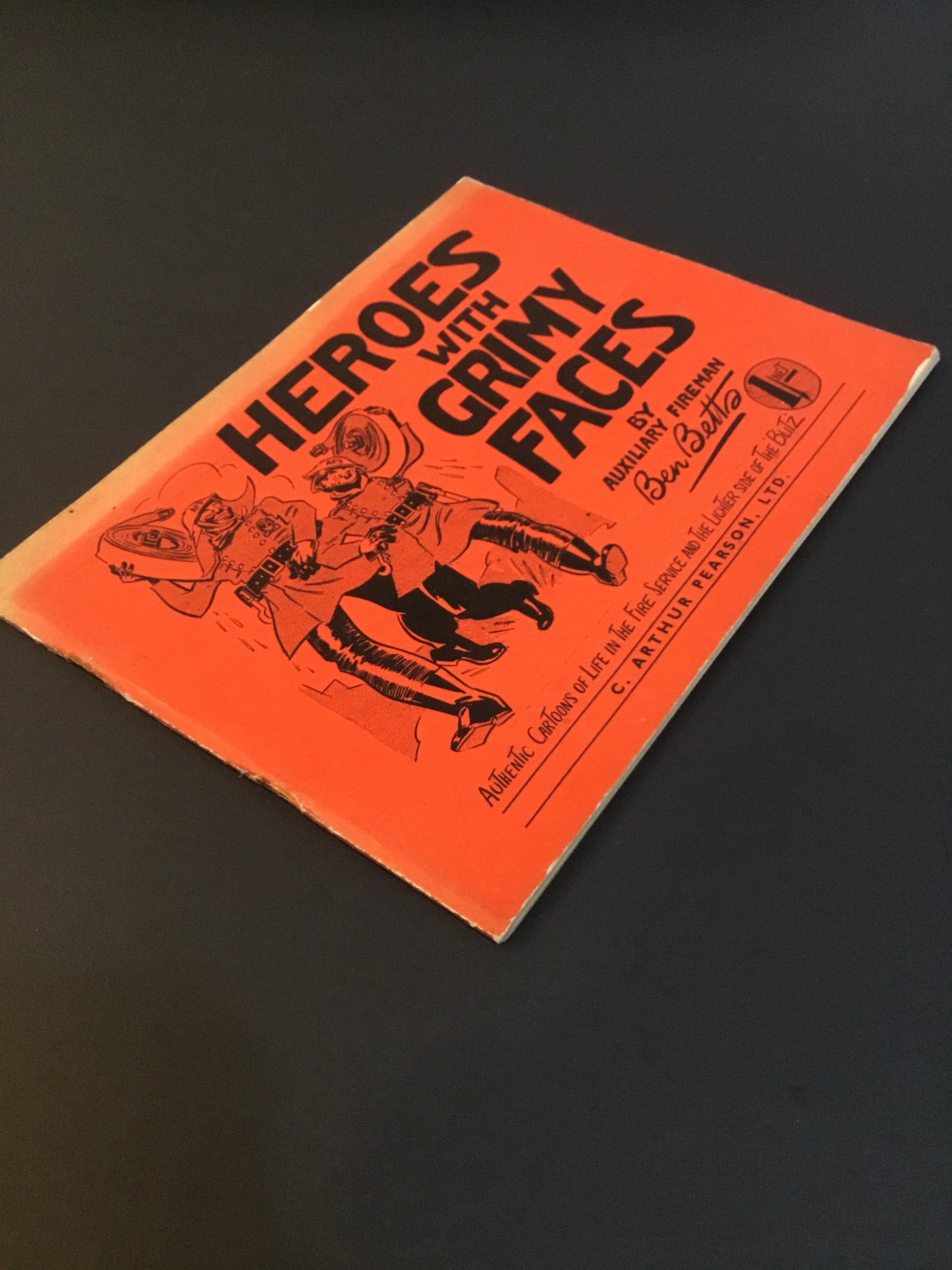 1942 Heroes with Grimy Faces Authentic Cartoons of Life in the Fire Service Book by Auxiliary Fireman BEN BETTS ,31 pages , filled with black and white cartoons of the time , all complete pages are loose due to rusted binding staples .