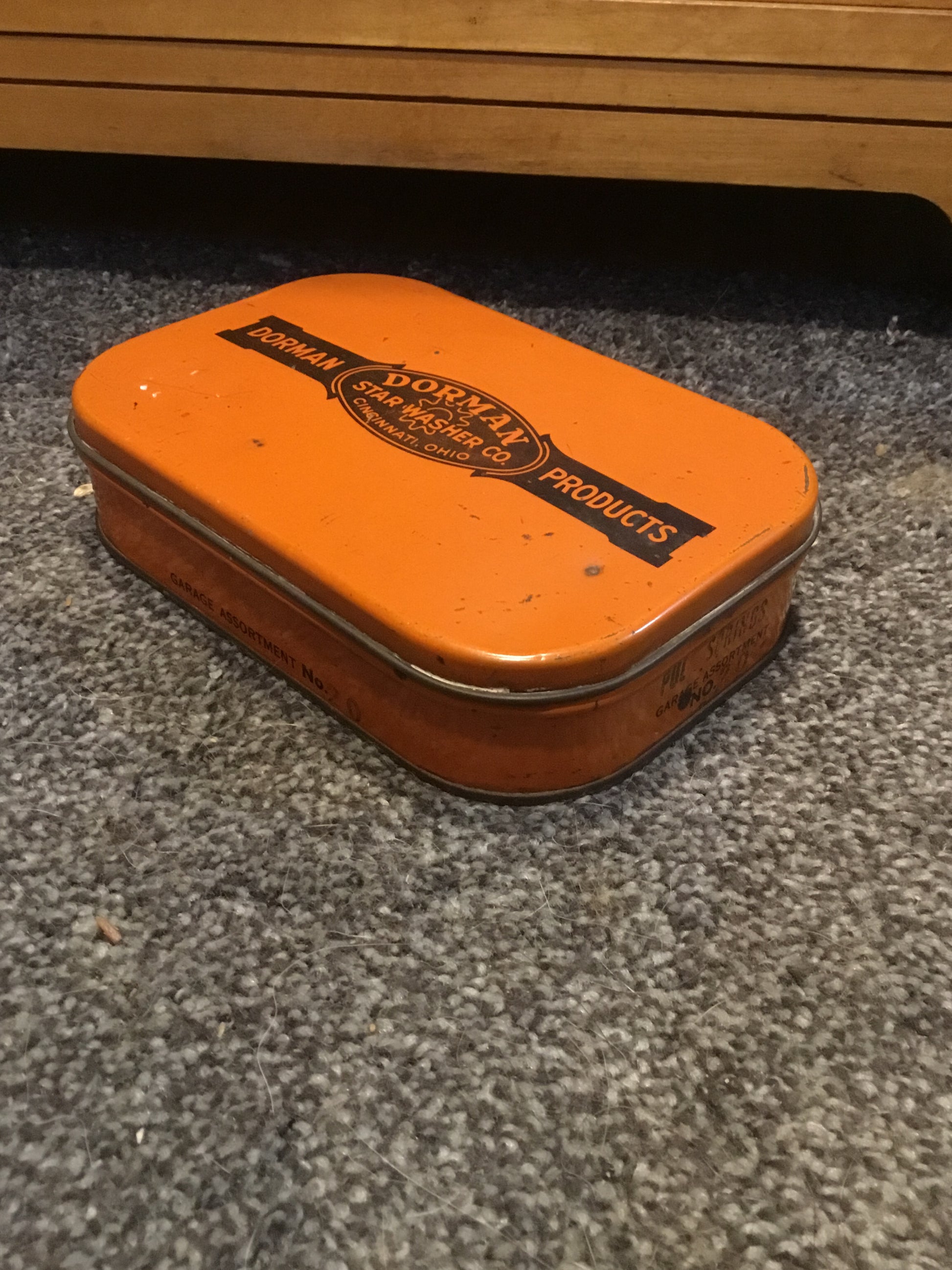 Dorman Star Washer Co. Tin , measures about 7 inches long , side reads Garage assortment No.20 , some light scratches , hinged top .