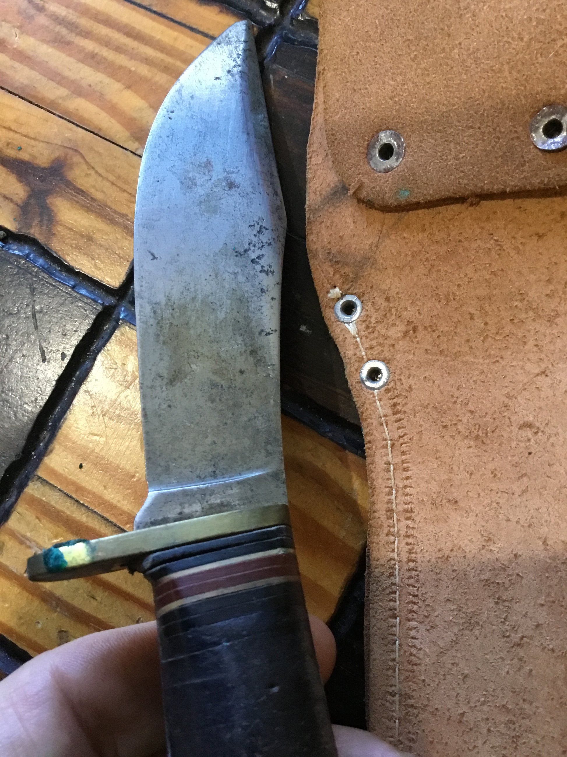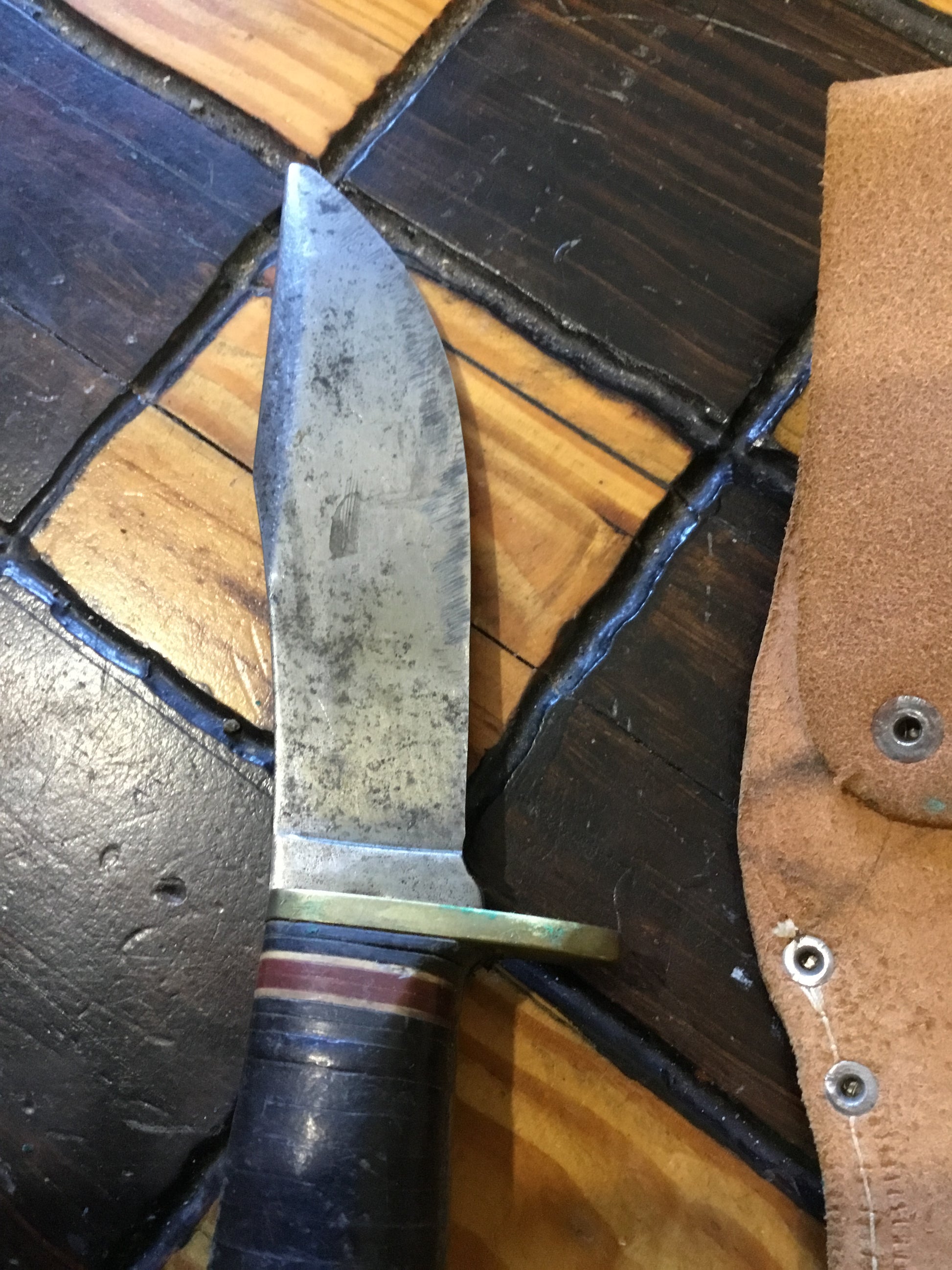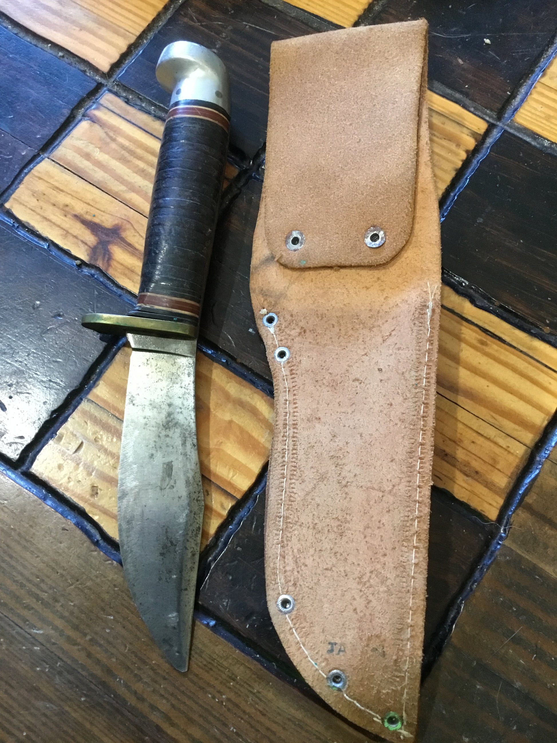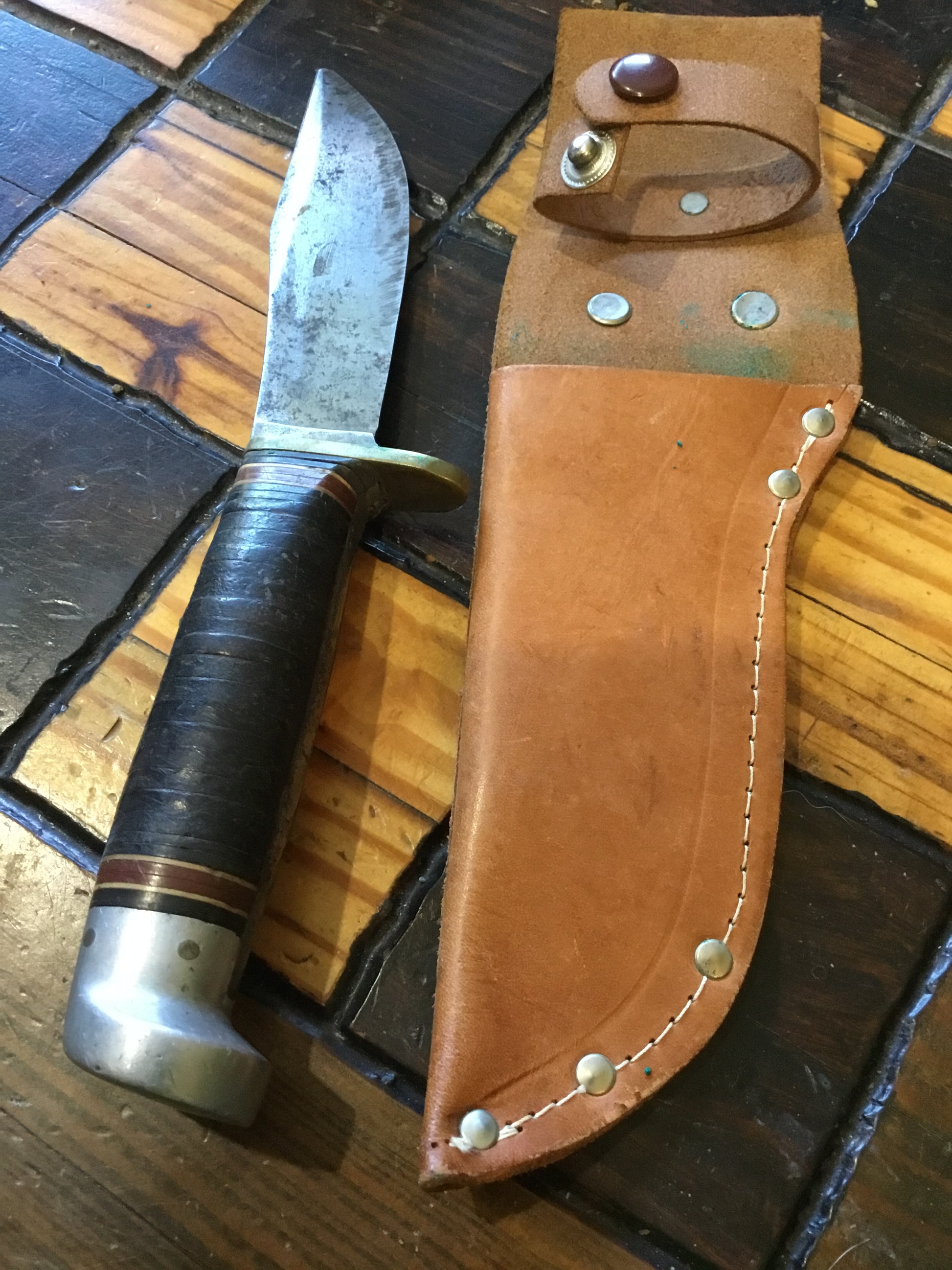 Fixed Blade Knife Hunting Knife 4 1/2 inch Blade ,9 inches overall ,pressed leather handle , no markers name , some staining and brass hilt is loose , stamped (WESTERN U.S.A L88 ) .Leather sheath is large for knife .