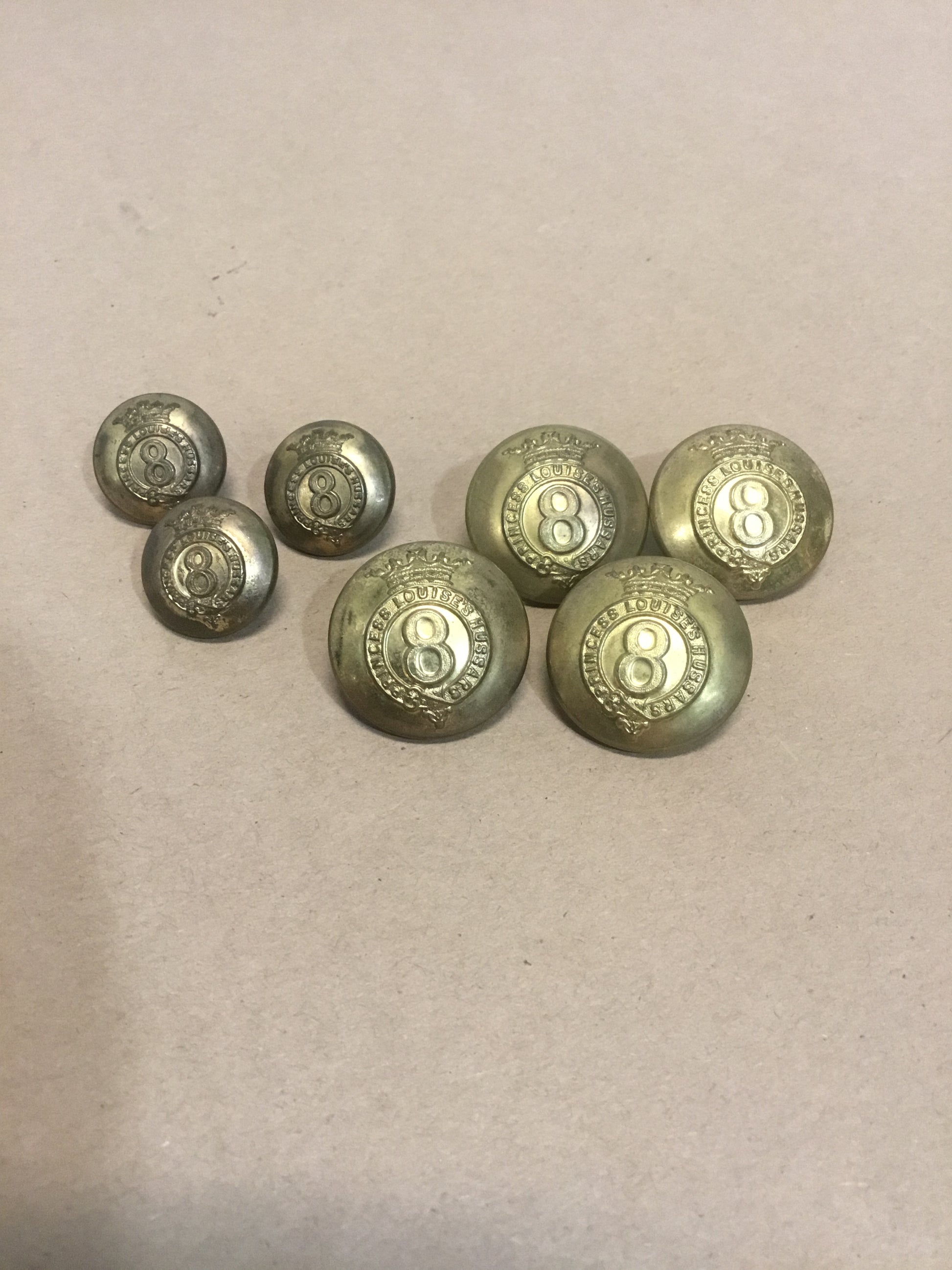 Lot of 7 Princess Louise, eighth hussars buttons , 4. Large and 3 smaller , all brass .Made by Scully Montreal . Canada .