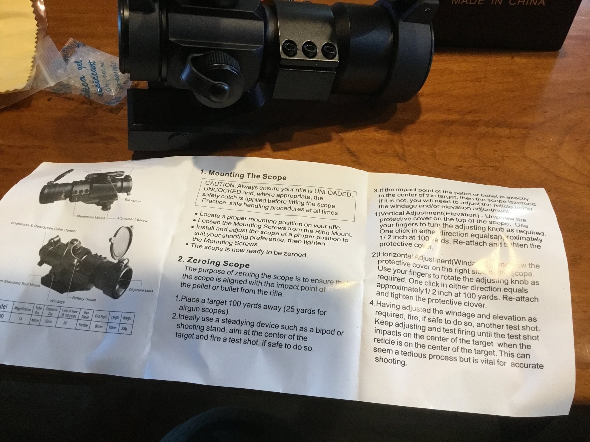 New Red- Green Dot Scope takes lithium Battery Included . Measures 5 inches by 3 tall .has dot brightness adjustment, Import .no magnification.
