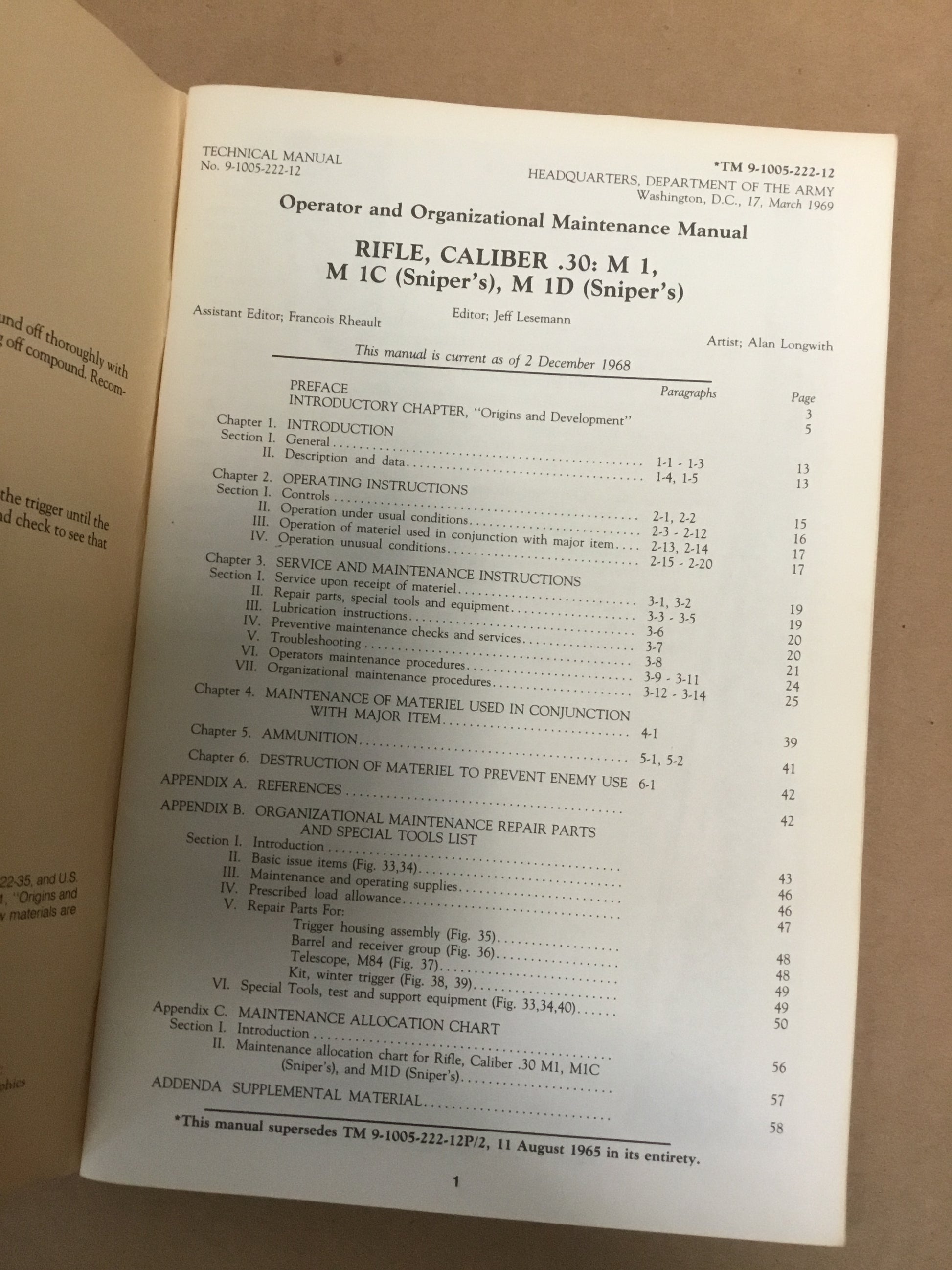 TM9-1005-222-12 Operator Manual including repair parts Rifle Caliber 30 M1 , Caliber 30 M1 C and 30.M1 D .64 pages ,lots of illustrations, reproduced by Grenadier Books Inc.
