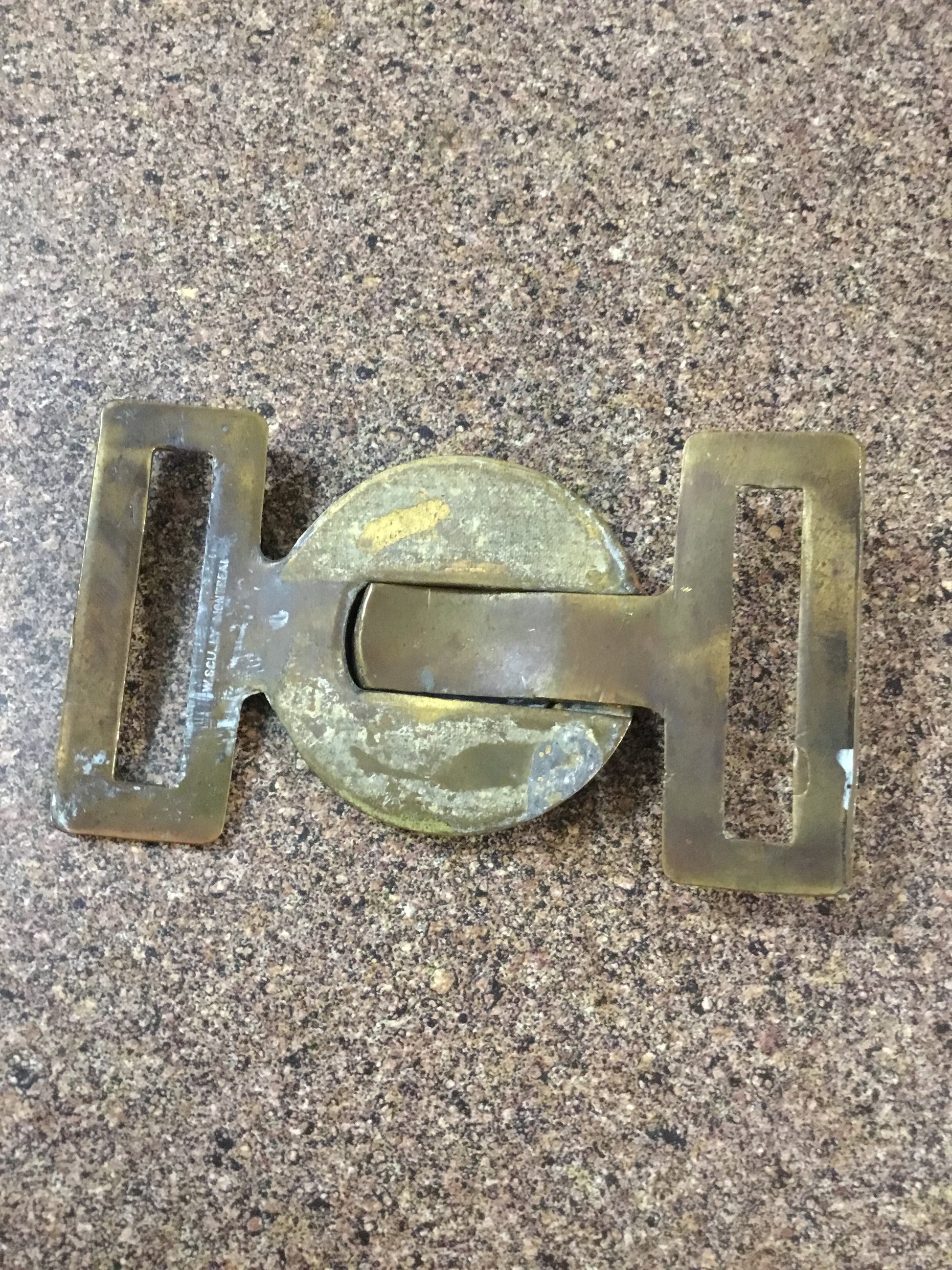 Two Piece Canadian Military Buckle with Queens Crown , made of brass ,stamped W SCULLY MONTREAL , some tarnishing.