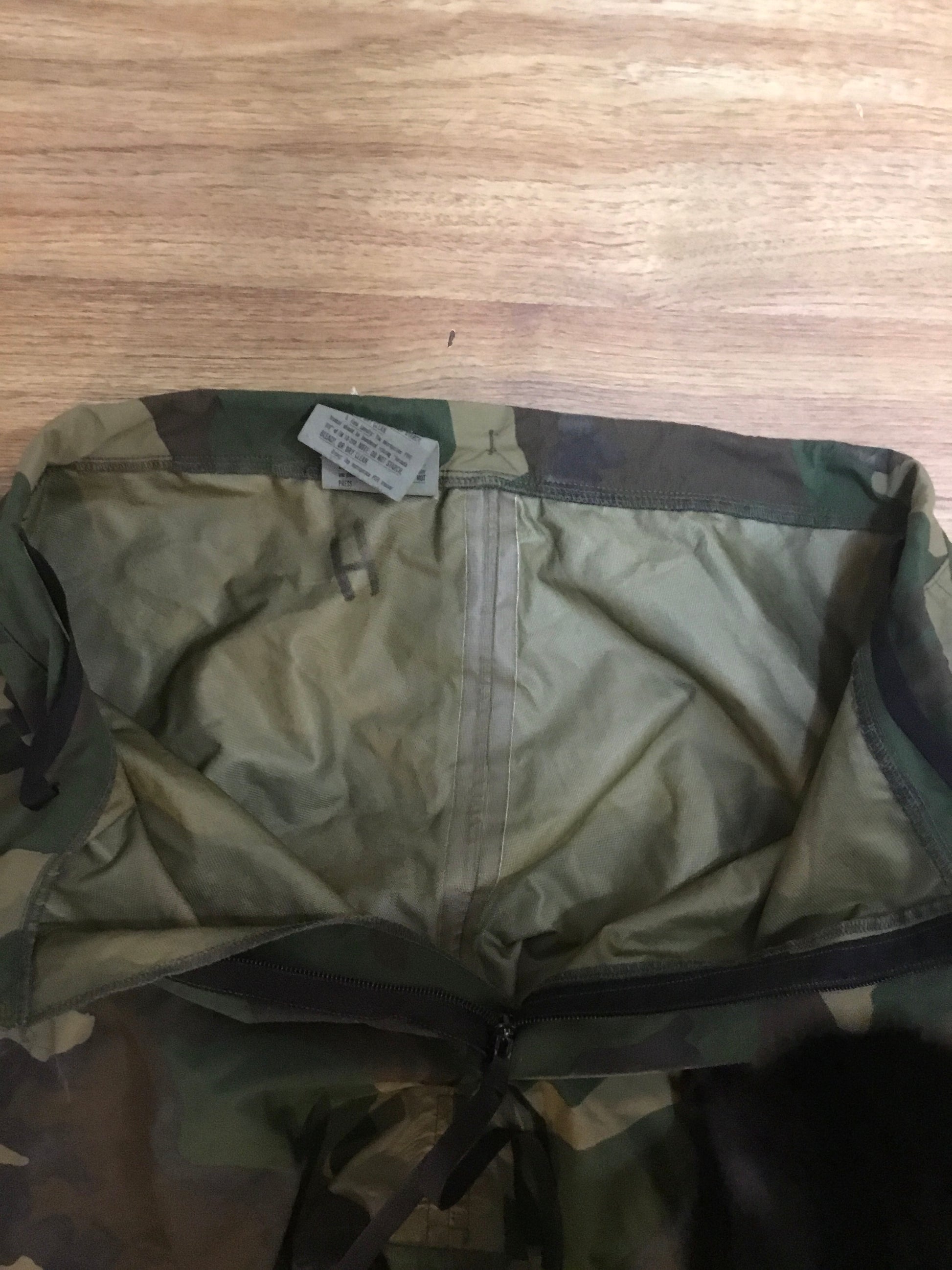 U.S. Military Woodland Pattern Wet Weather Pants size small tall , waist up to 31 inches max , gore Tex lined ,zipper up legs , some use in good condition .