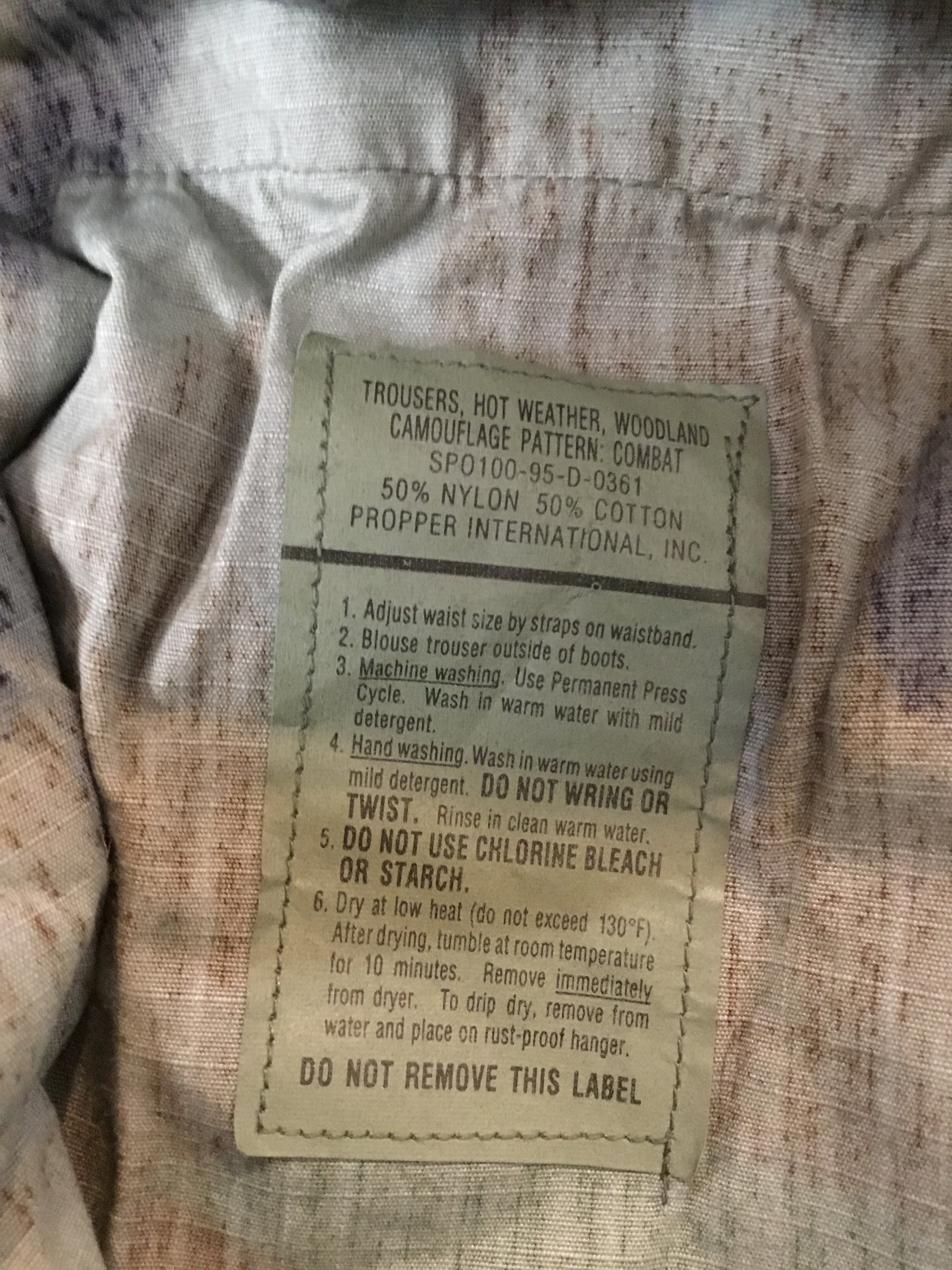 U.S. WOODLAND CAMOUFLAGE PANTS MEDIUM TALL Made of 50% cotton and 50% nylon , in very good condition, button fly and drawstring leg cuffs , waist is up to 35 inches .