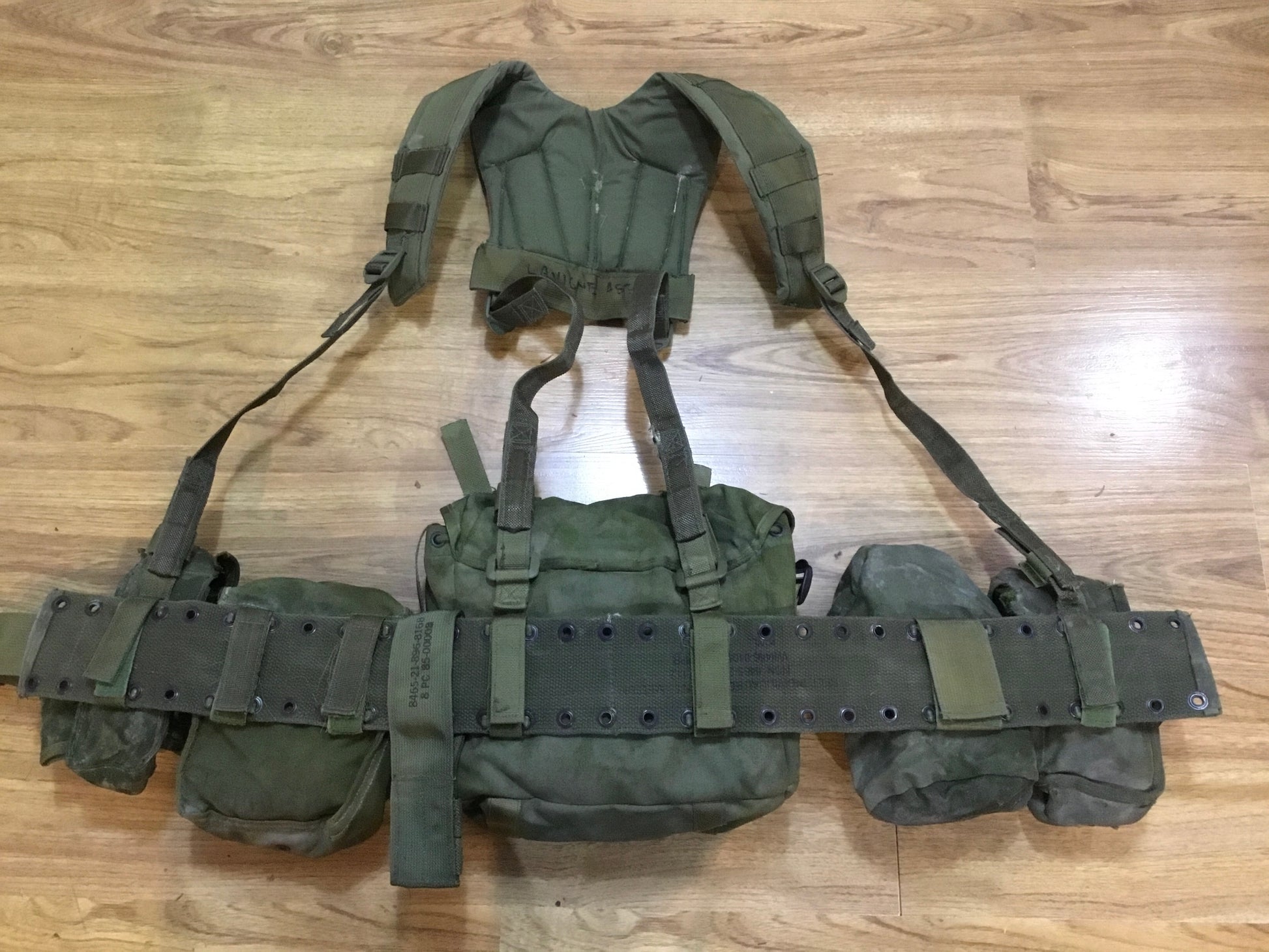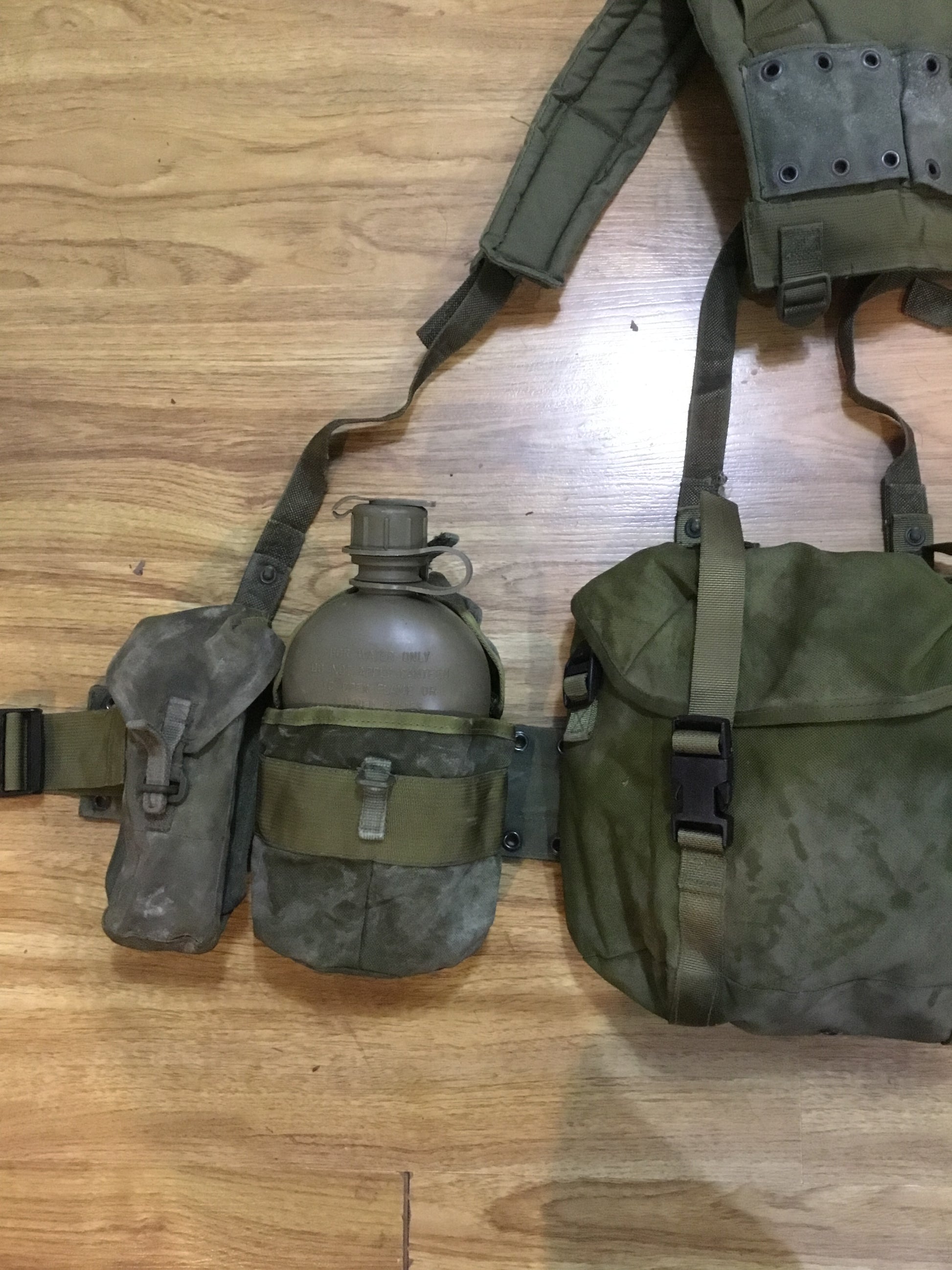 Vintage Canadian Forces 1982 Pattern Webbing Set , consisting of belt, suspenders, utility pouch, C7 bayonet Frog , canteen and holder , 2) C7 mag pouch one different then the other , Fanny/ Butt pack .all in good condition but does have staining and wear from age , belt and suspenders are adjustable, belt would fit 34 to 38 inches .