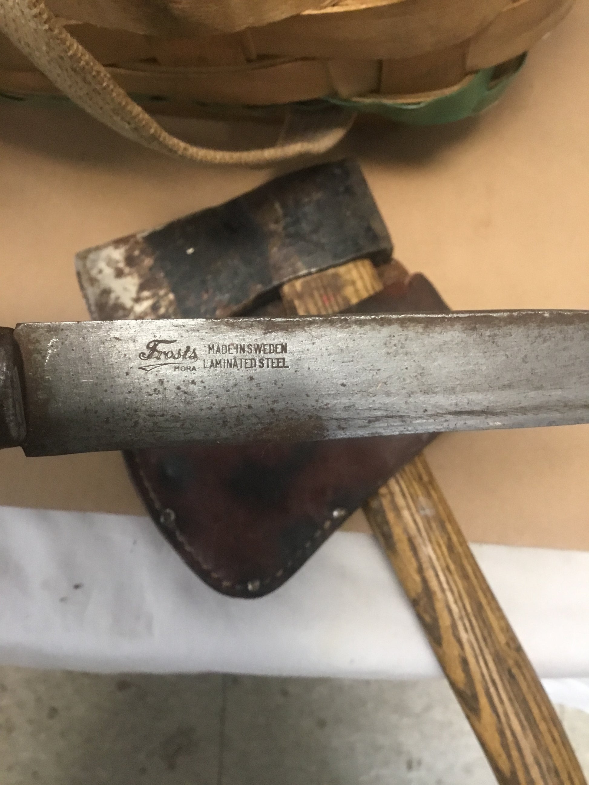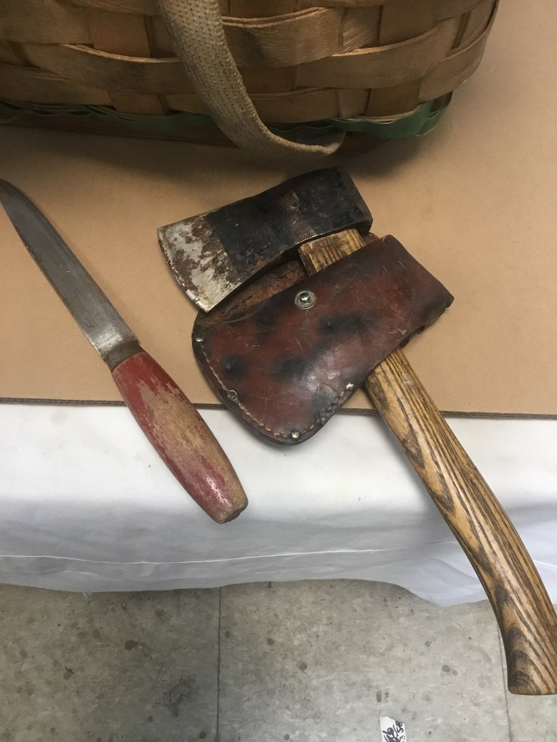 Vintage Canadian Made Trappers Basket with carry straps , measures 18 inches tall ,Wide 10 1/2 inches and LENGHT 16 inches , in good solid condition , one damaged weave , comes with small hatchet and old mora knife , stamped ( Elmer Trick Trapper Supplies , Clinton Ont.