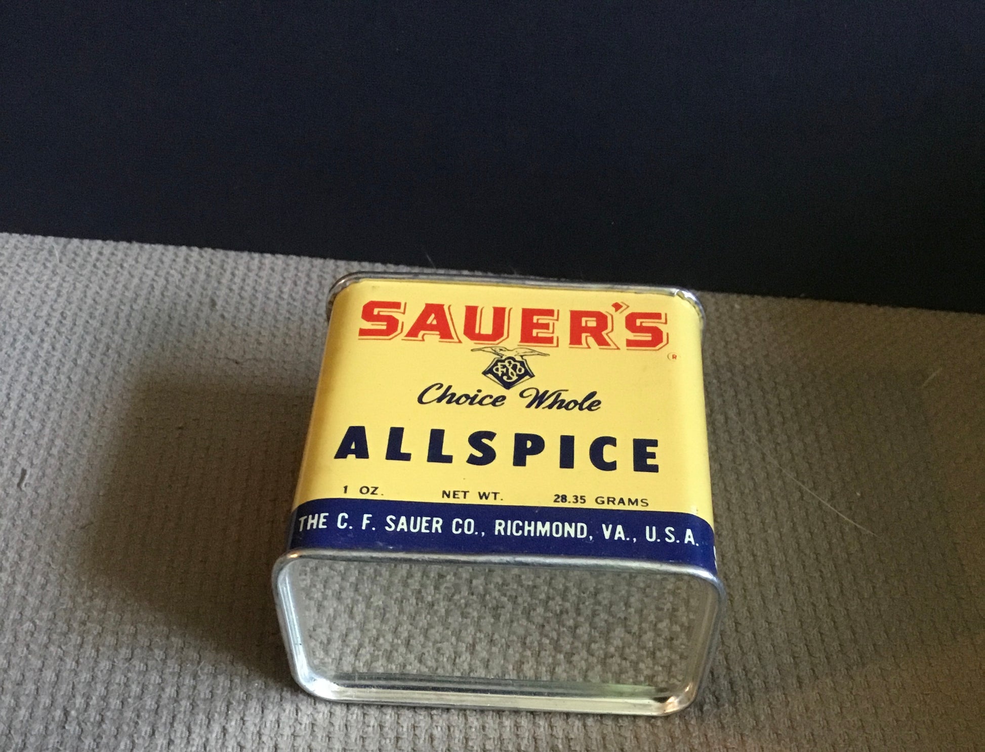 VINTAGE KITCHEN SPICE TIN SAUER'S MACE 1950S,The tin measures 2 1/4" high x 2 3/8" wide , still has contents, not usable.