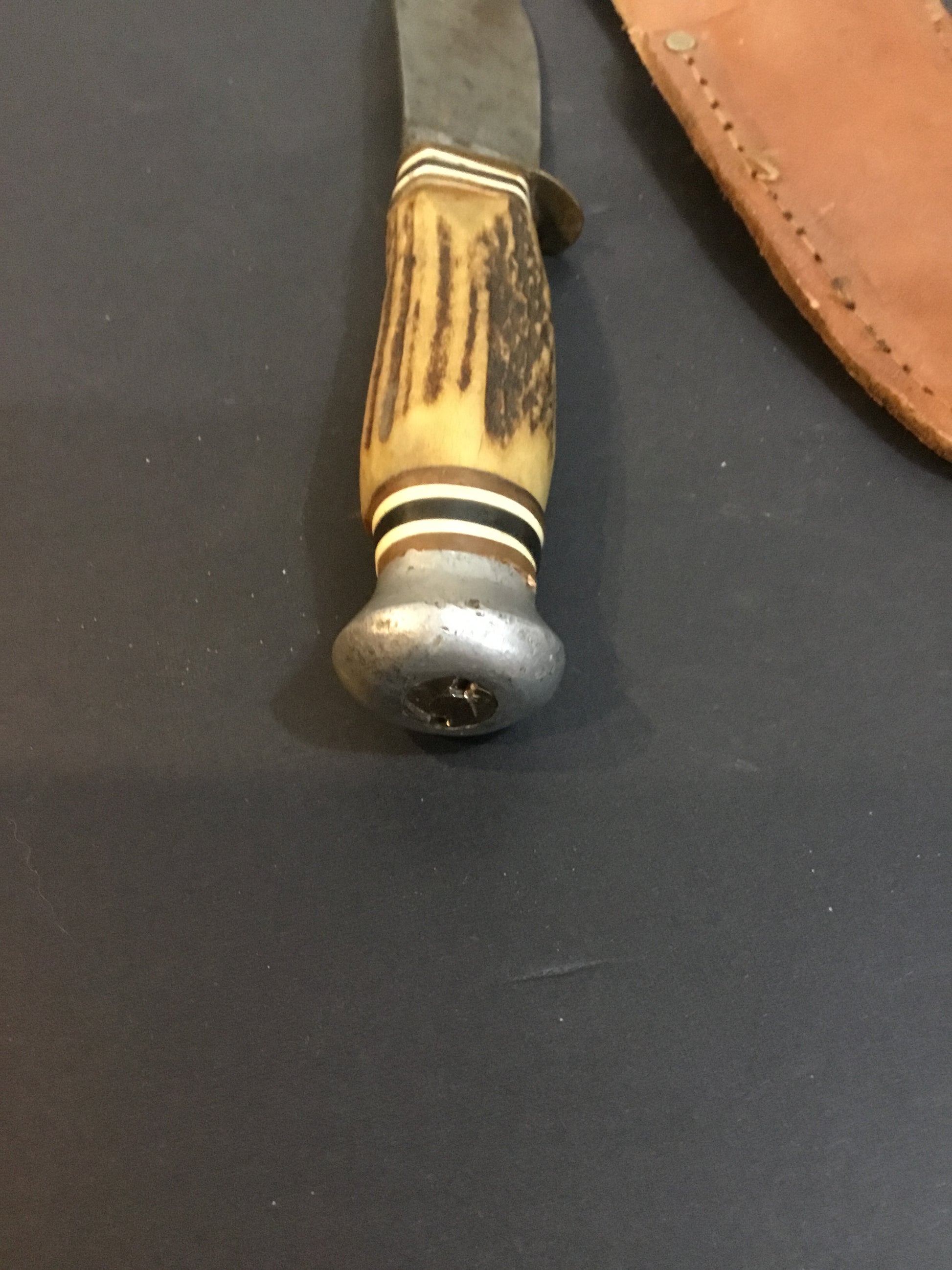 Vintage Lamplough Hunting Knife Solingen Germany , bone handle ,carbon steel , blade tip is damaged and handle is loose . Measures 8 inches overall .Leather sheath .