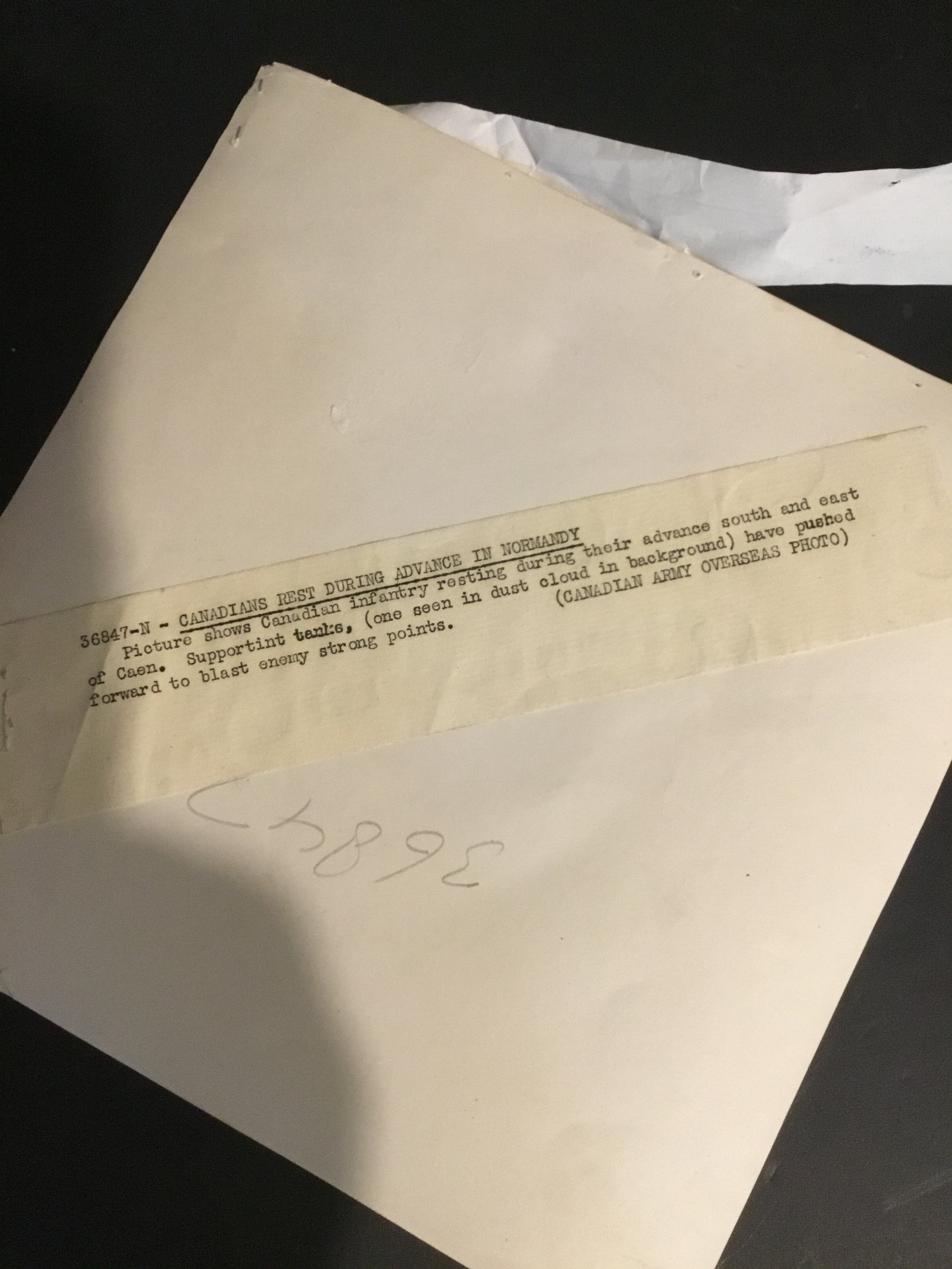 WW11 Canadians in Normandy Photo with Description , size is 8x8 inches , shows a group of soldiers ,bayonets fixed, as a tank rolls by .photos shows wear no tears .
